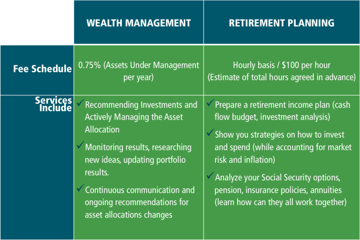 - Additional services such as tax planning, estate planning, and risk management are typically included in the overall fee.